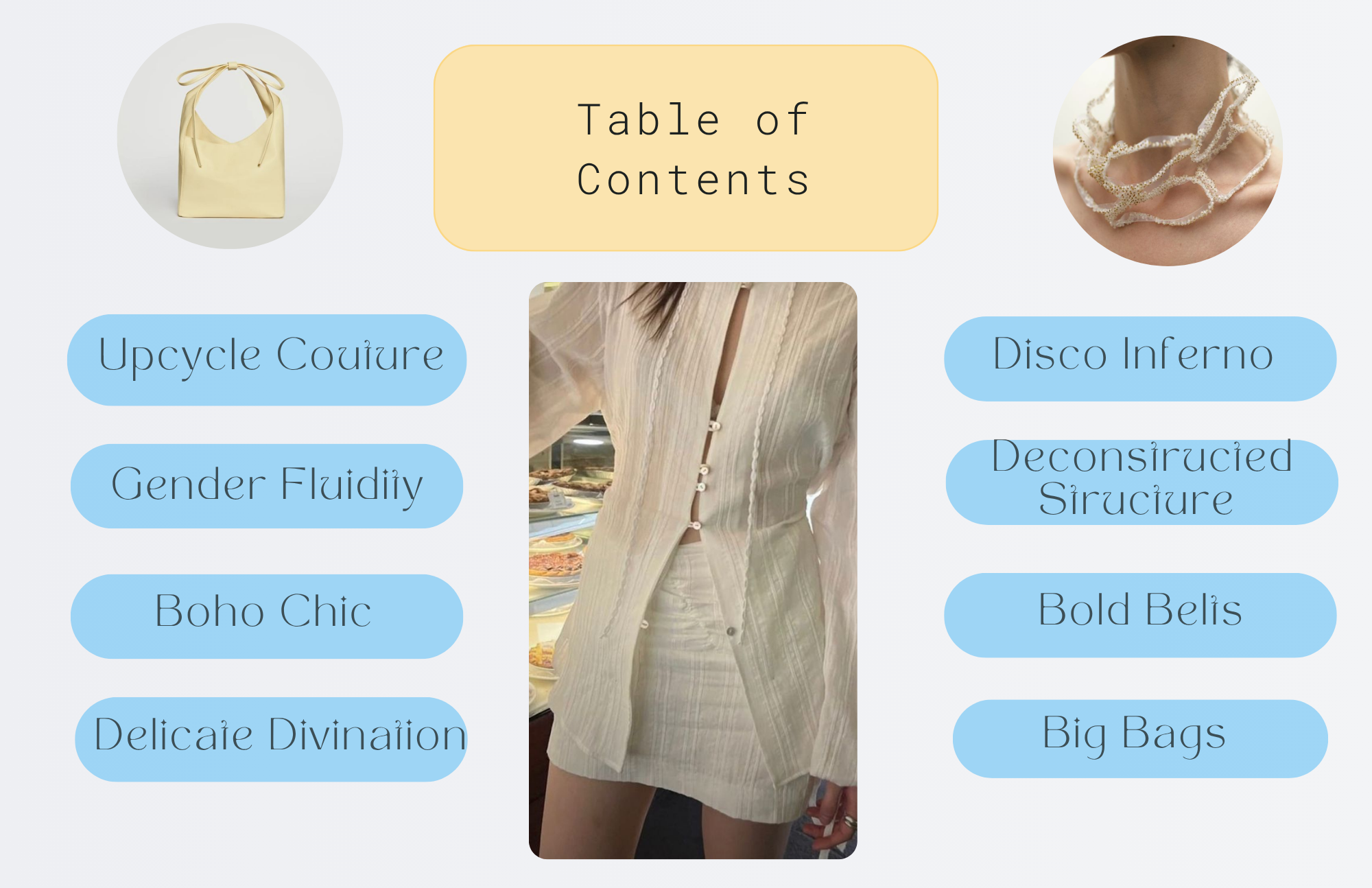 This Fashion Trend Report 2024 provides an in-depth analysis of the complex cultural and aesthetic forces currently shaping the women's wear market. The analysis dissects eight key trends, ranging from the ethereal, romantic drama of "Delicate Divination" and the maximalist glamour of "Disco Inferno," to the strategic shifts toward circular fashion ("Upcycle Couture") and fluid tailoring ("Gender Fluidity"). This project demonstrates rigorous research methodology, successfully translating broad market movements into clear, actionable visual and strategic insights for the upcoming season.